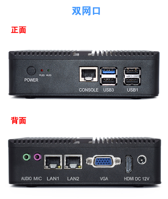 I/O接口 5* USB2.0接口1*USB3.0接口;1* HDMI接口;1* VGA接口;2* RJ45千兆网络接口;1* Line out(绿色),1* MIC(紫色);1* 开机按钮;1* 12V DC JACK输入;1* 硬盘指示灯,1*电源指示灯